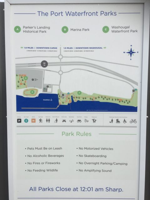 There are three parking lots that can be used for these parks. 1) At the west end, park in the Port of Camas-Washougal Parking lot at S A St and S 1st St; 2) Park at the Washougal Waterfront Park on S 2nd St; or 3) continue east on Frontage Rd and park in the lot at the east end of the Waterfront Park.