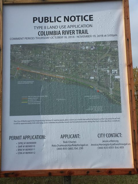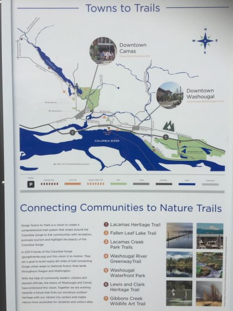 Three parks create an area for a shoreline walk. Parkers Landing Historical Park includes displays about the history of the site, including works of the Chinook people. Next to that is the Marine Park with memorials to Washougal soldiers lost in foreign wars. You can then walk east to the Washougal Waterfront Park which includes a wide concrete walking path. there are side trails from the walking path for a yet to be developed nature trail along the river. Plans are also in the works to build a .64 mile multi-use path from the east end of the park to connect with Steamboat Landing Park which will then provide a completed trail connection to Captain William Clark Park and to Steigerwald Lake Wildlife Refuge.